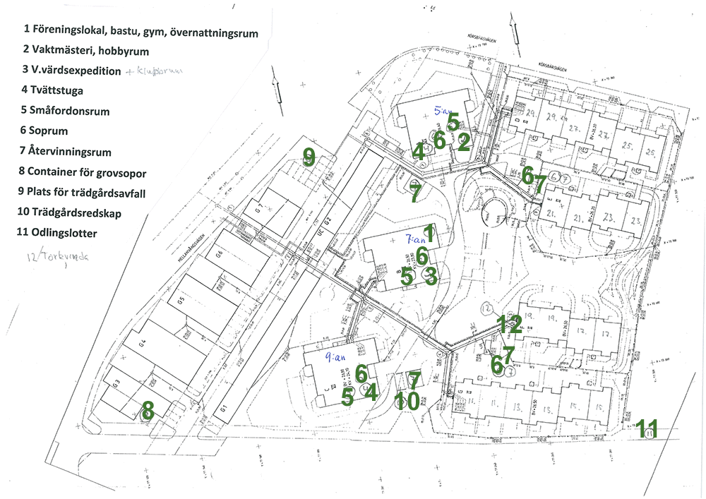 Vi har fyra gemensamma tvättstugor, en gemensamhetslokal med bastu, motionsrum och övernattningsrum. En hobbylokal finns i anslutning till vaktmästeriet. Det finns även ett klubbrum för ca 10 personer. Vi har stora gemensamma grönytor och lekplatser för barnen.